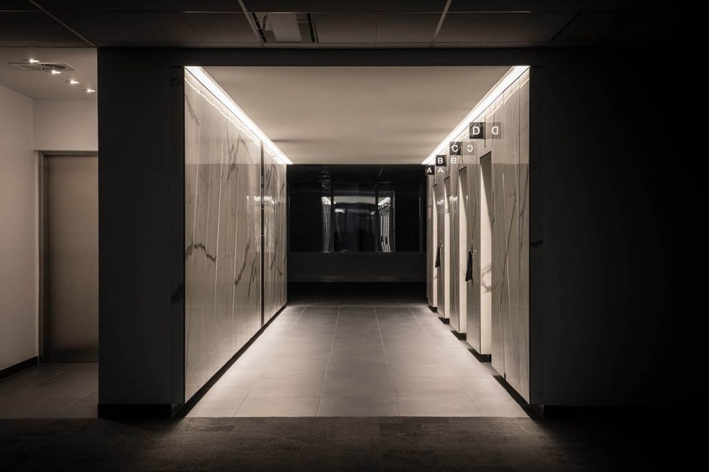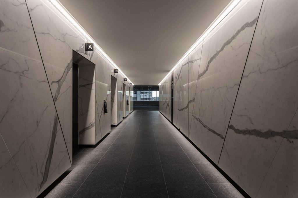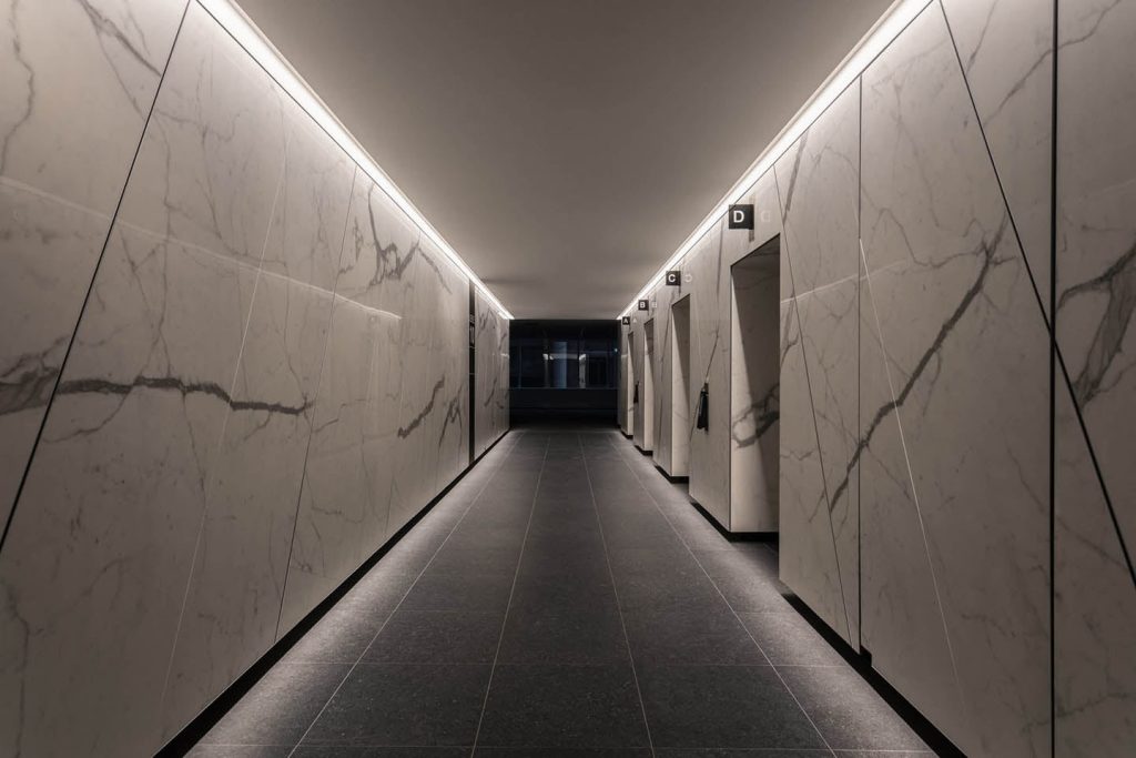 This recently completed project by Forge Venture Management entailed base building works including lift lobby upgrades featuring SLIM TRIM with COMBO-NARROW optic lens to create the sense of dramatic contrast achieved.