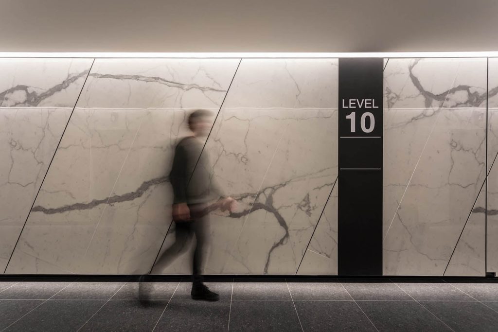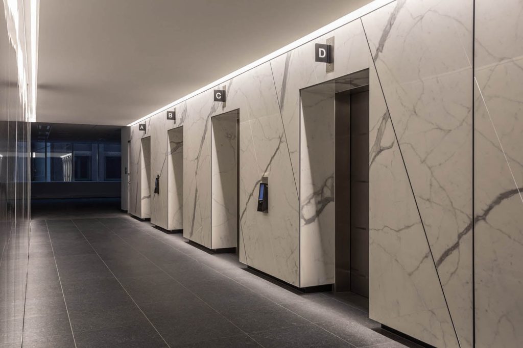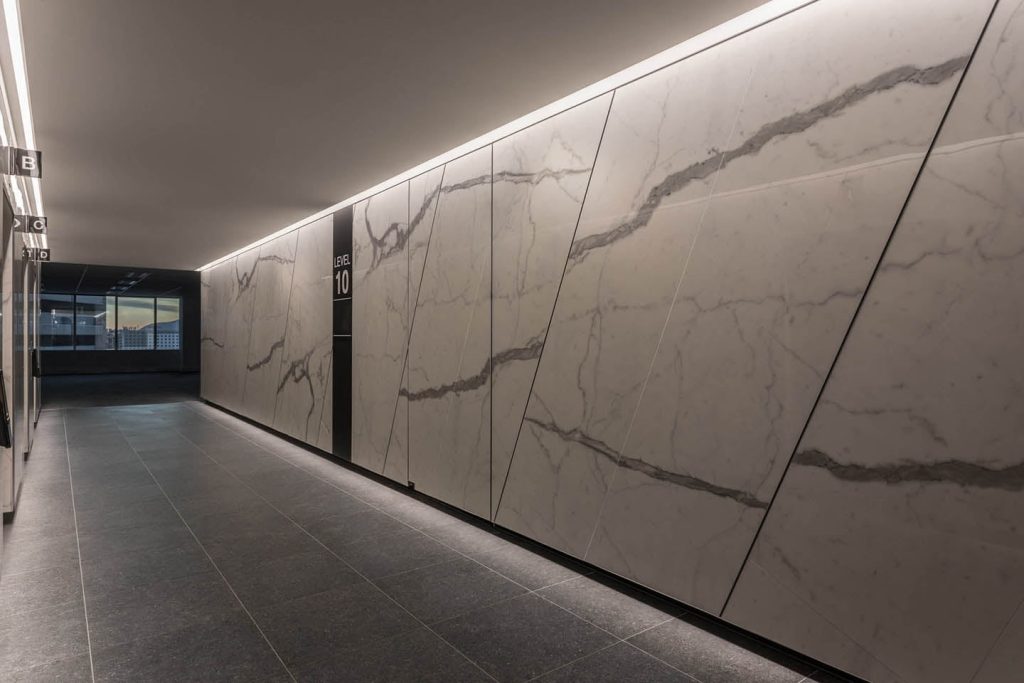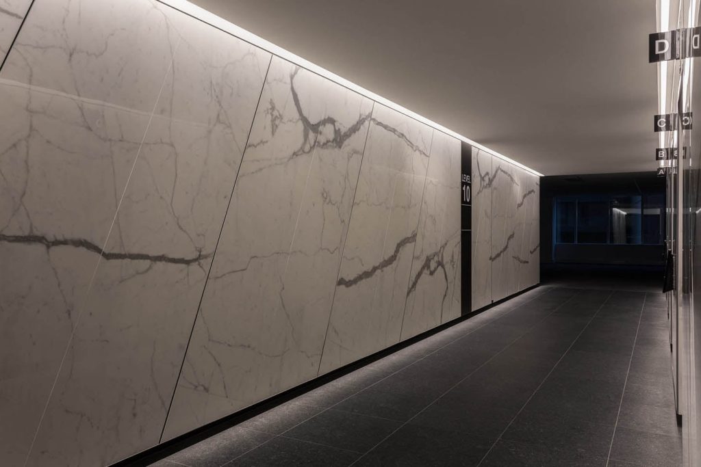 A simple but effective lighting design by Lightwaves for this stunning lift lobby at 1 Market Street Sydney, for Investa Property Group.