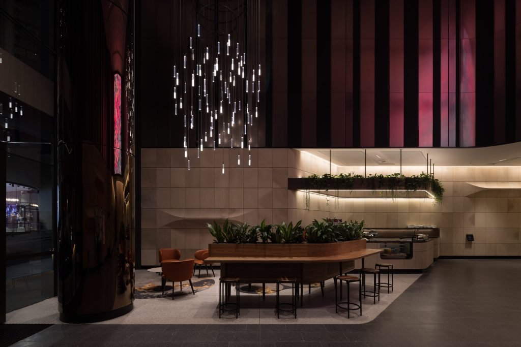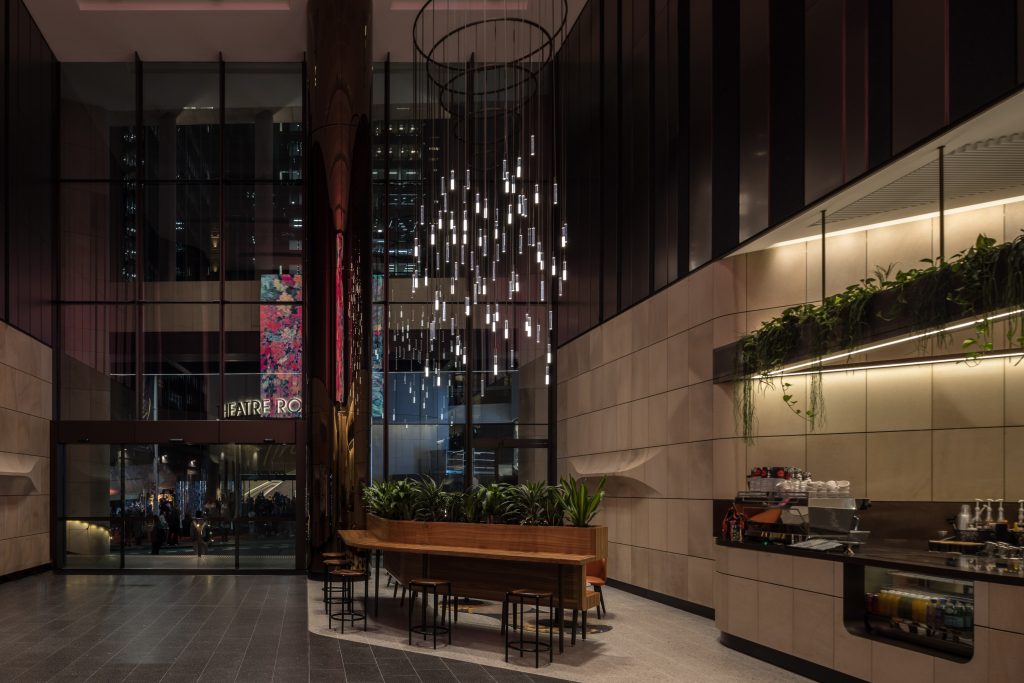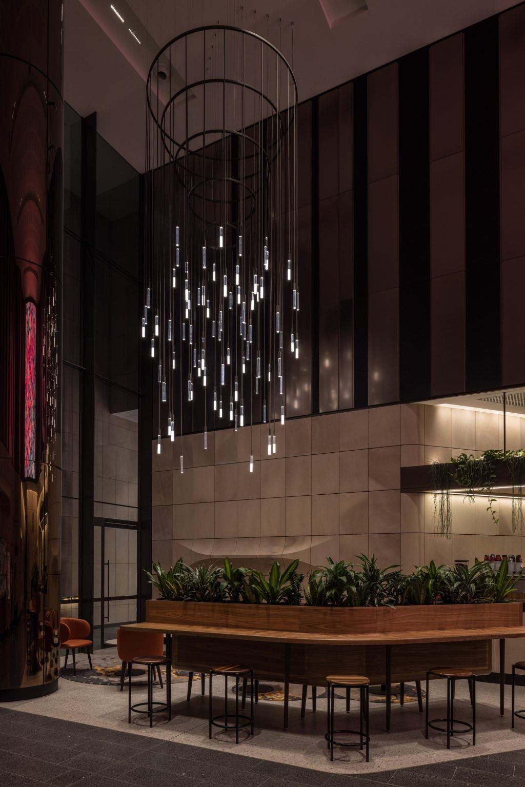 The transformation of 135 King Street, imparted a prominent blending of commerce and retail at the heart of Sydney’s CBD. Central to this project is the bespoke chandelier which evolved from a standard decorative product, TALLBOY; -customised by Lightwaves to boast 85 individual pendants, cleverly divided: half with transparent diffusers, and half with split transparent/translucent diffusers to create a nuanced and harmonious lighting effect. Meticulous craftsmanship extends to the suspension system, wherein each luminaire is rod-suspended for cable concealment and aesthetic stability.