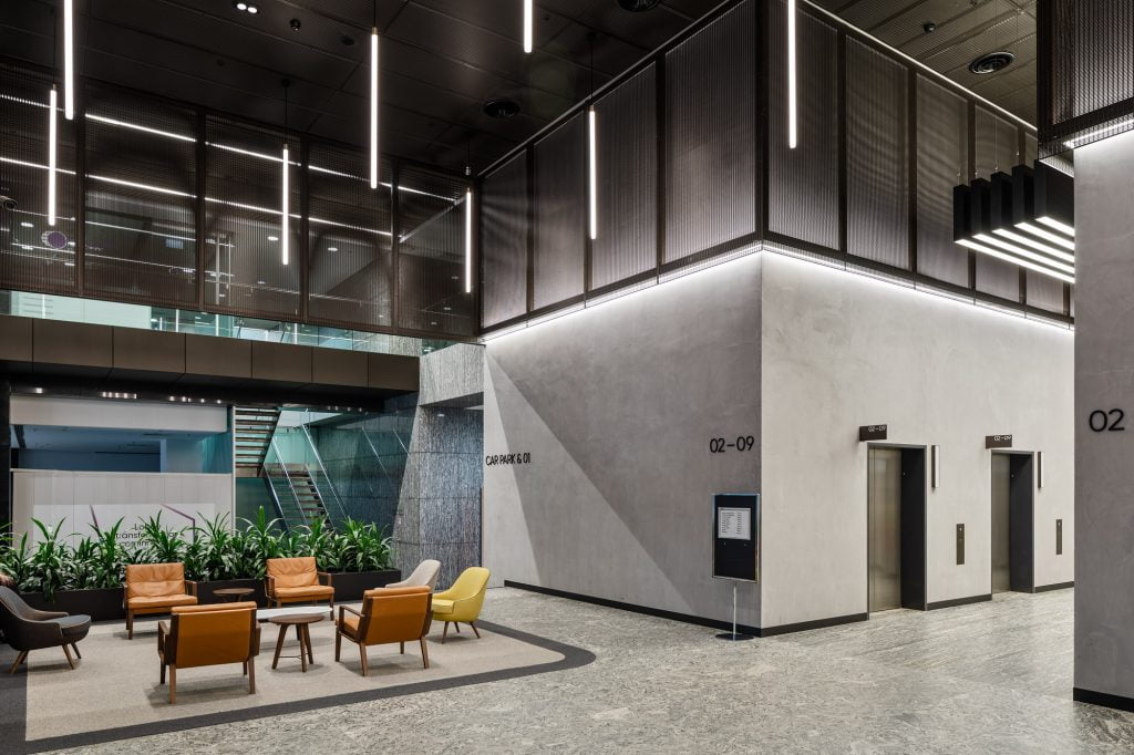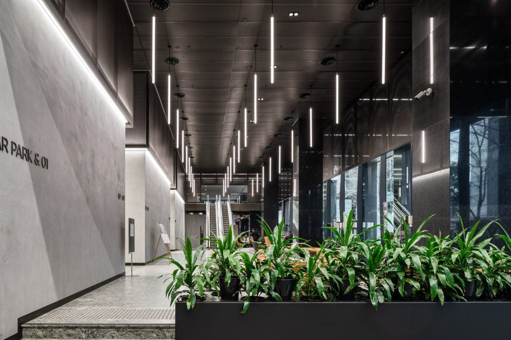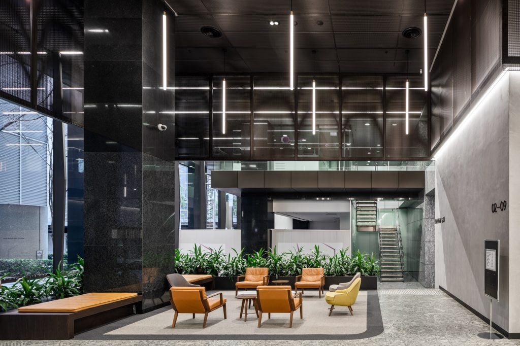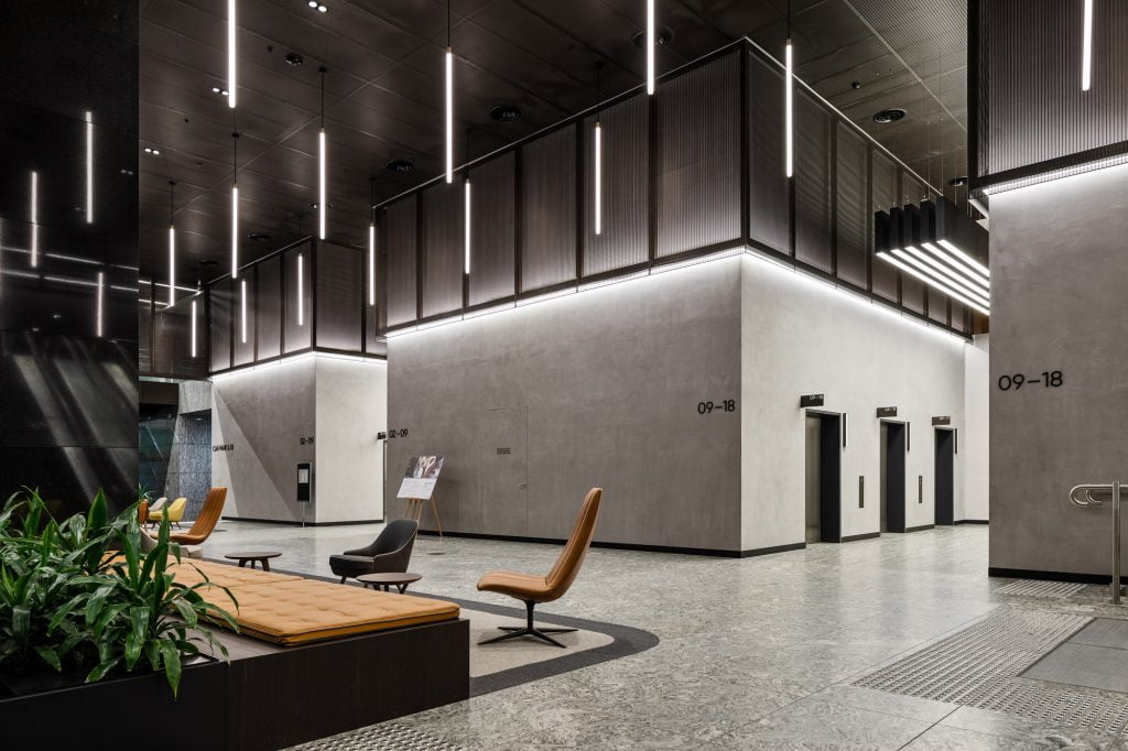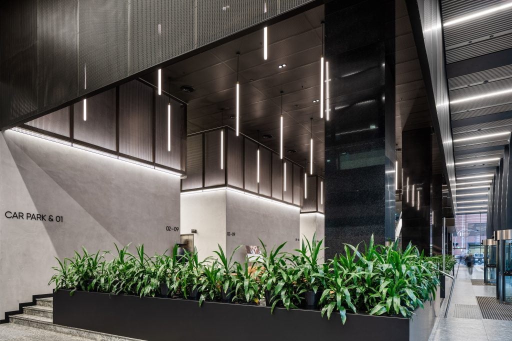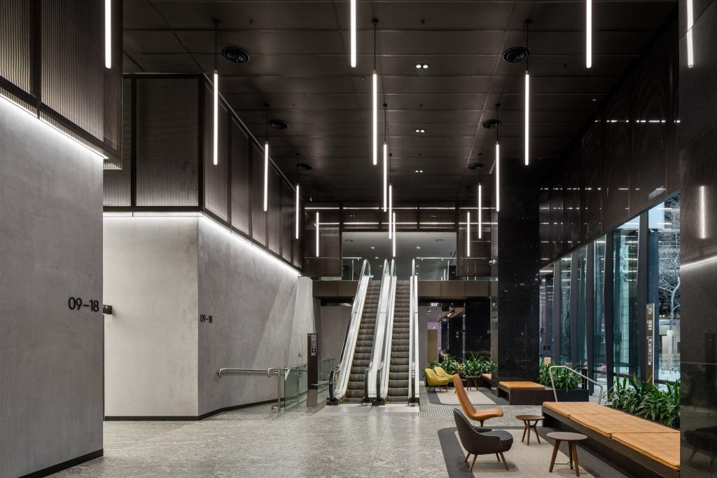 Custom-built linear pendant fixtures in the lift lobbies, originally supplied by DARKON in 2010, were retained in the integrated design but were retrofitted with Tridonic LED gear trays as an upgrade from fluorescent lamps.