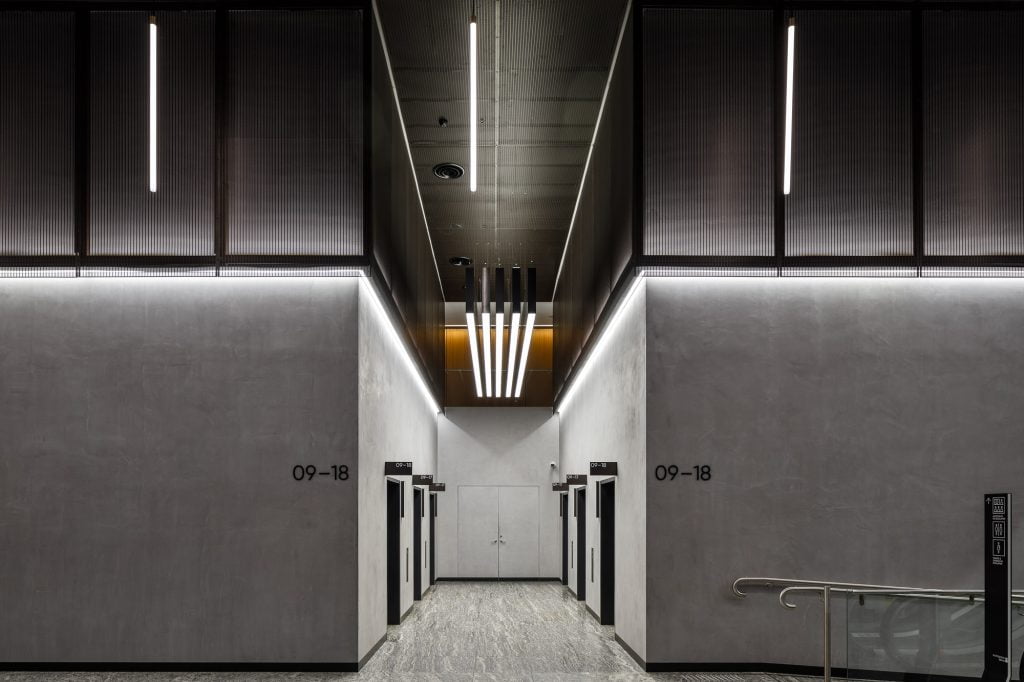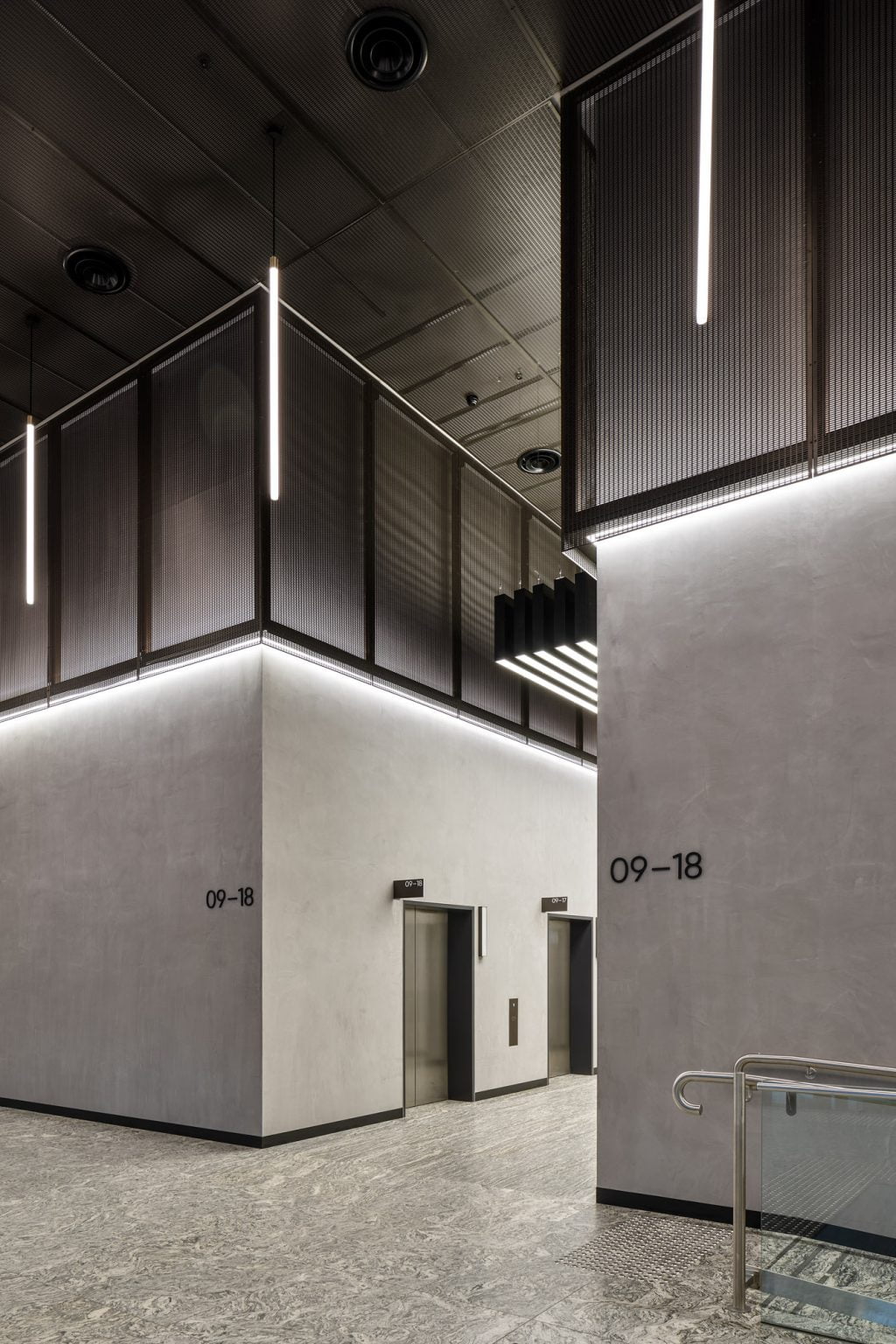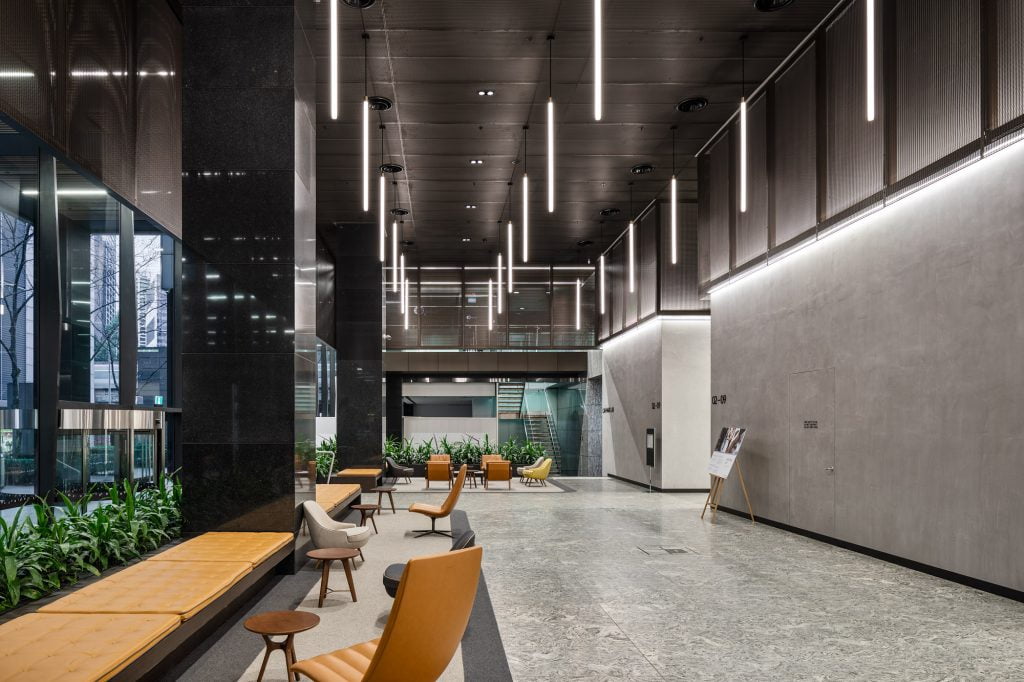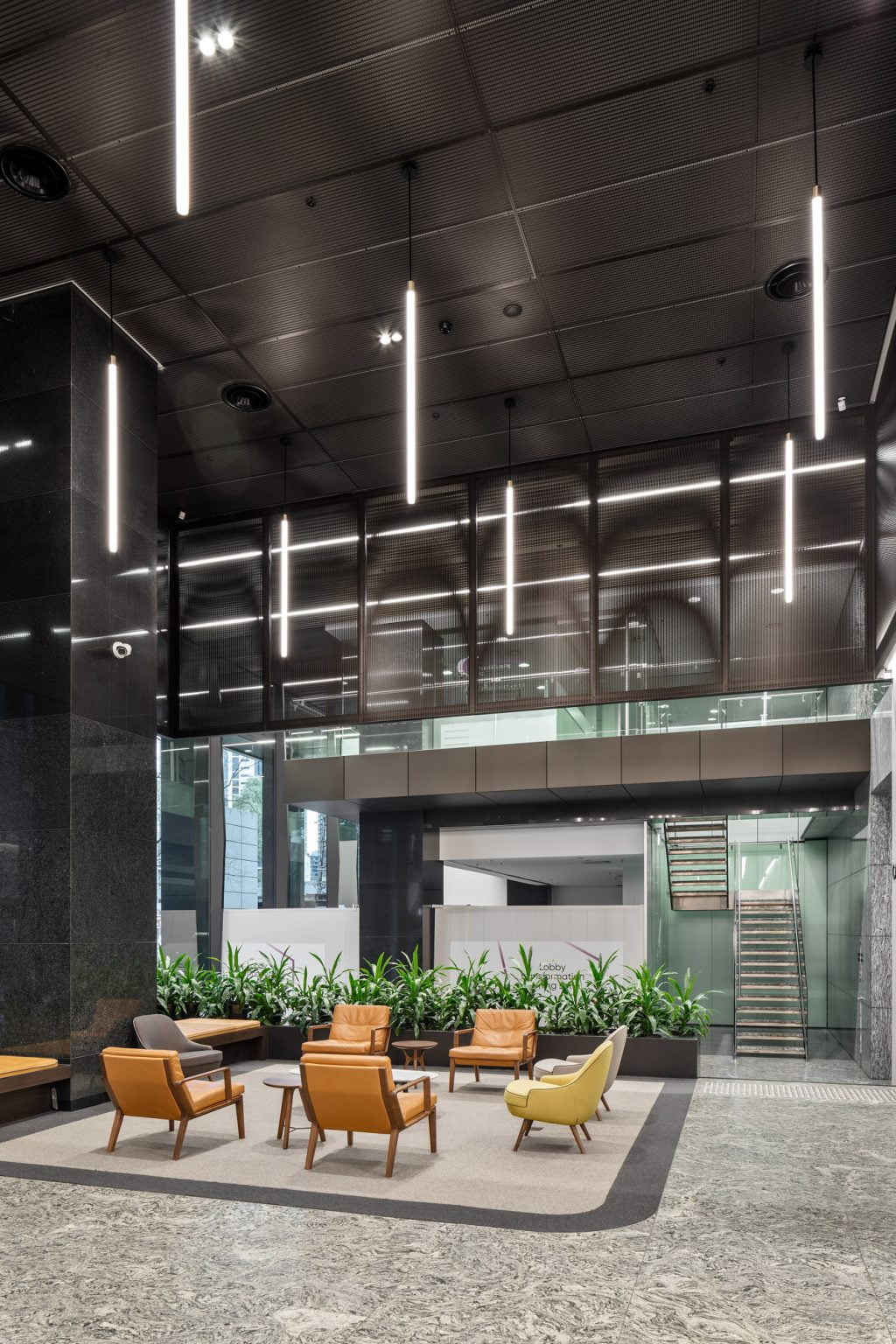 Custom-built linear pendant fixtures in the lift lobbies, originally supplied by DARKON in 2010, were retained in the integrated design but were retrofitted with Tridonic LED gear trays as an upgrade from fluorescent lamps.