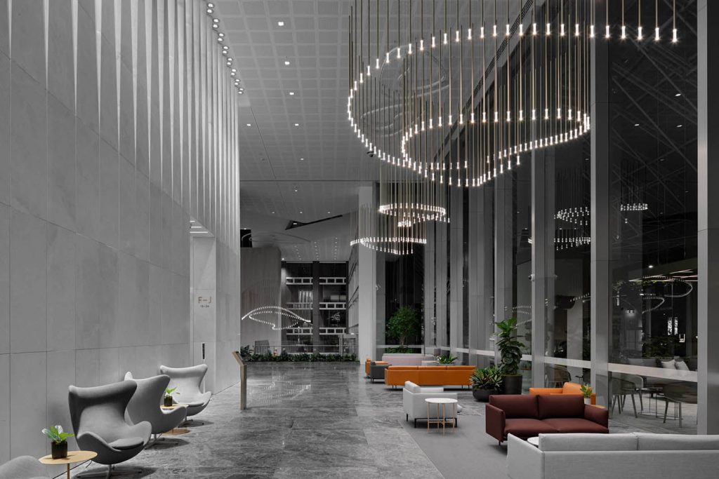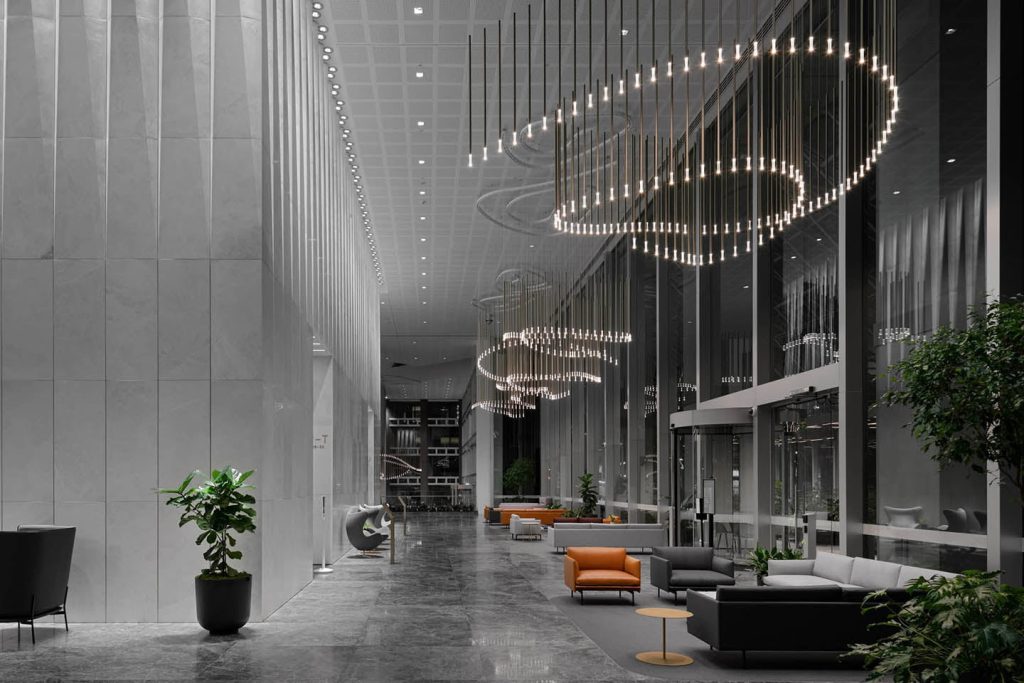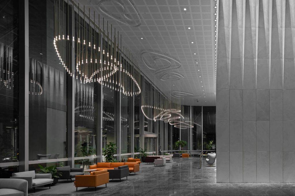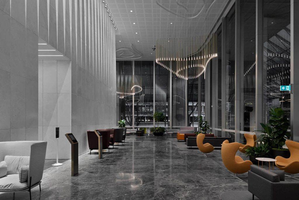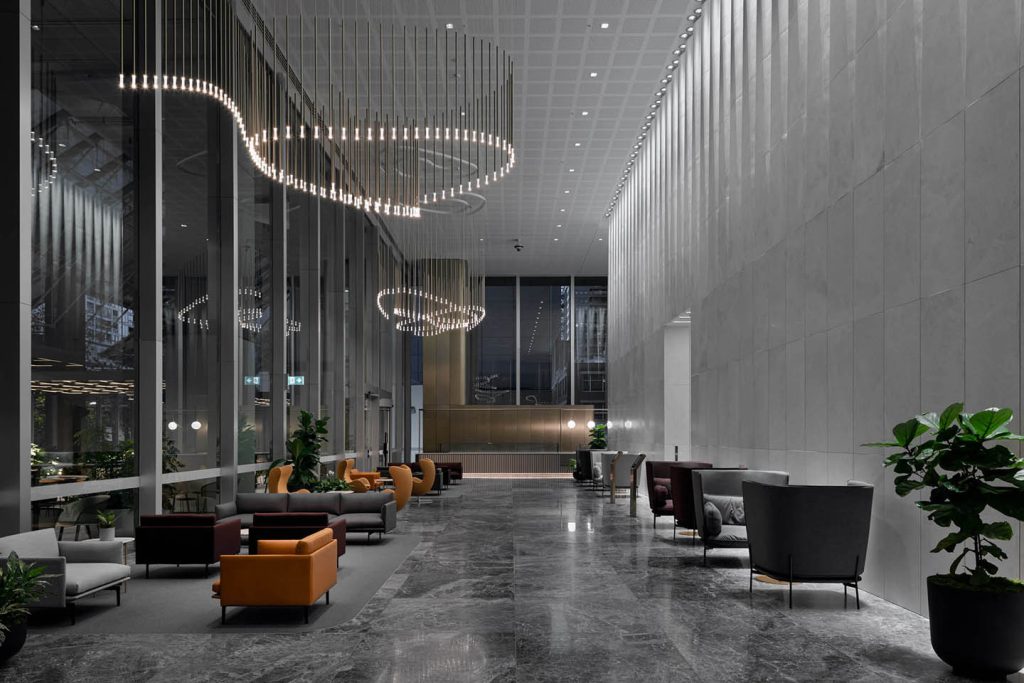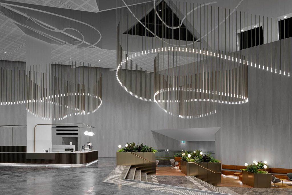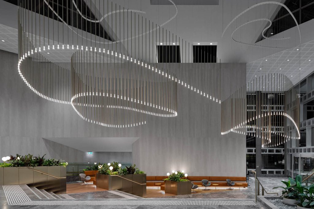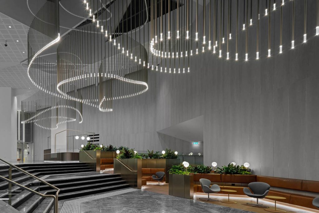 This elegant and timeless piece of 1,263 vertical champagne anodised pendants undulates throughout the lobby voids creating a visual play of reflection, form and illumination throughout the day and night. Their immersive scale juxtaposed with an unexpected buoyancy fill the generous volumes of the lobby space, creating an aesthetic focus to the gathering spaces below without taking away from the transparency and natural light this space has to offer.