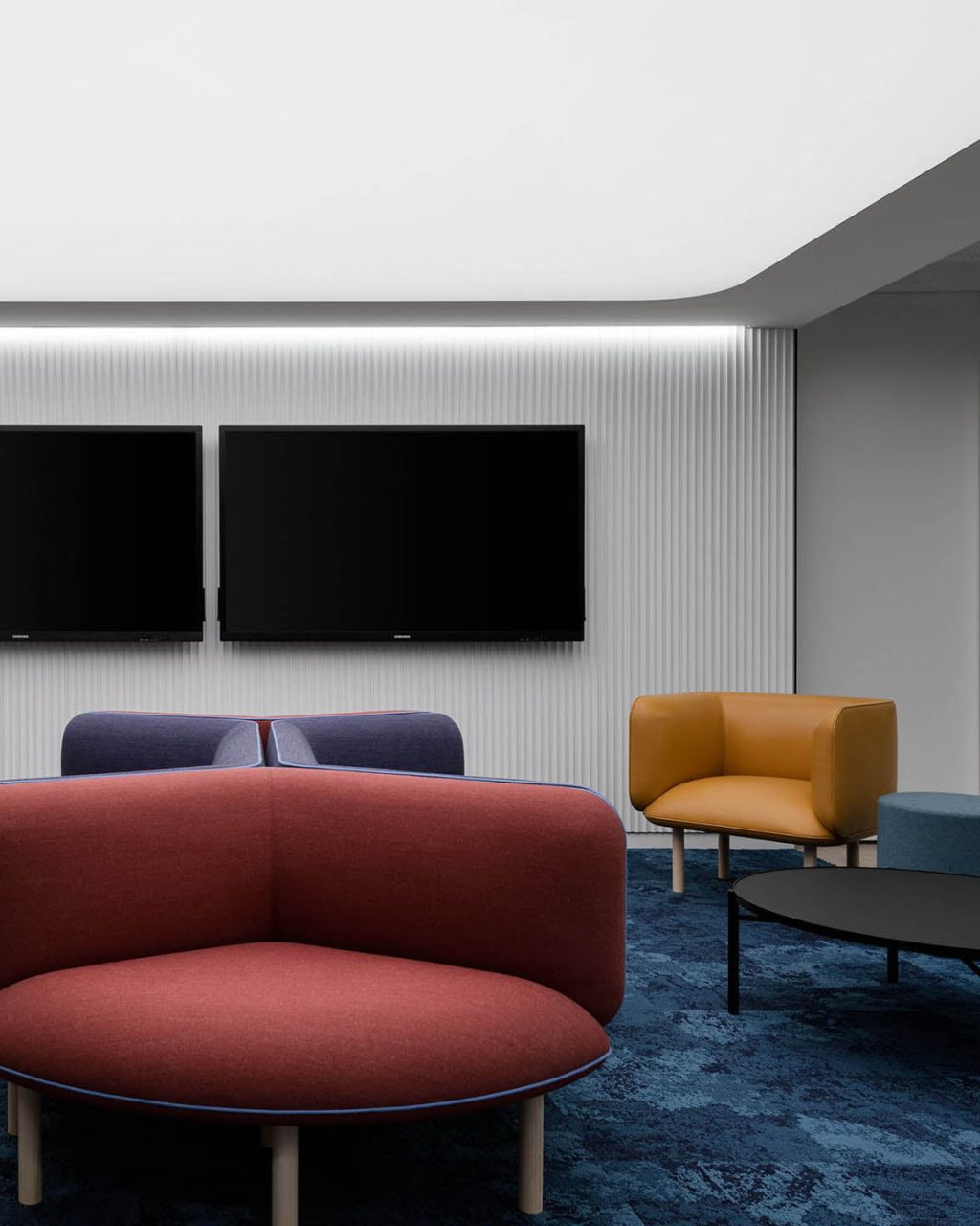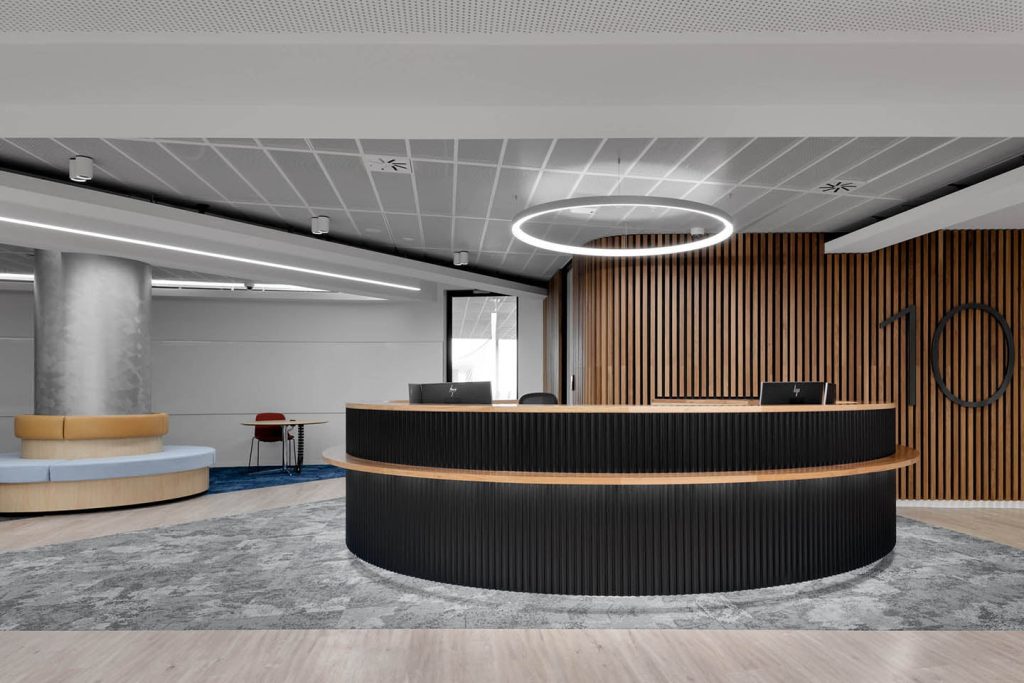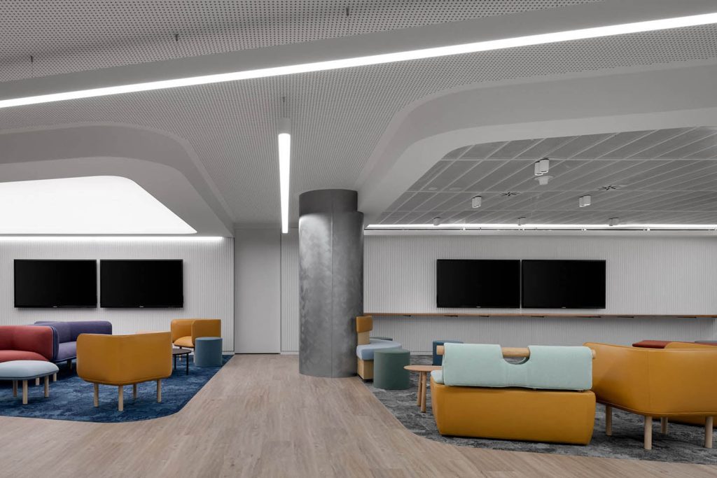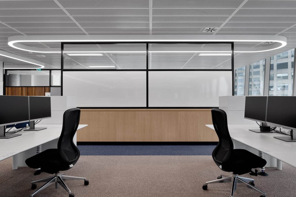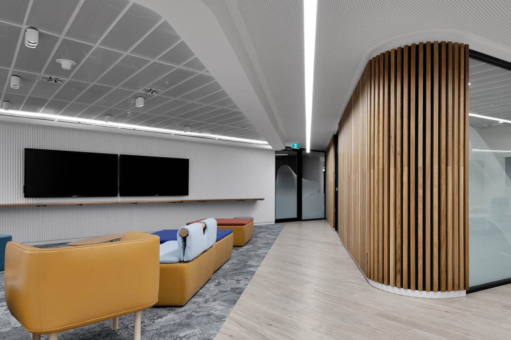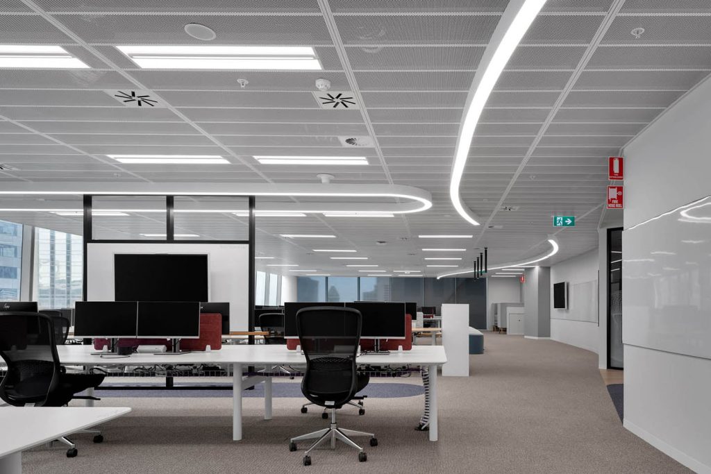 A fitout of 5 levels of the Cenitex tenancy was recently completed by Multiplex with lighting inclusions coordinated by Aston Consulting Group and architect, PTID. The sweeping curves of MRS T RADII soften the interior geometry and complement the architectural design neatly. Electrical works were expertly executed by contractors Ion Electrical, including installation of the AMBIENT RING pendant which floats above the circular reception desk adding a subtle decorative element to the entry foyer.