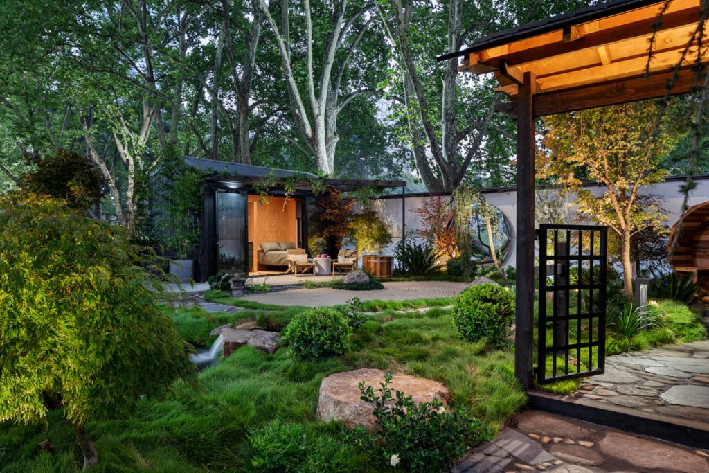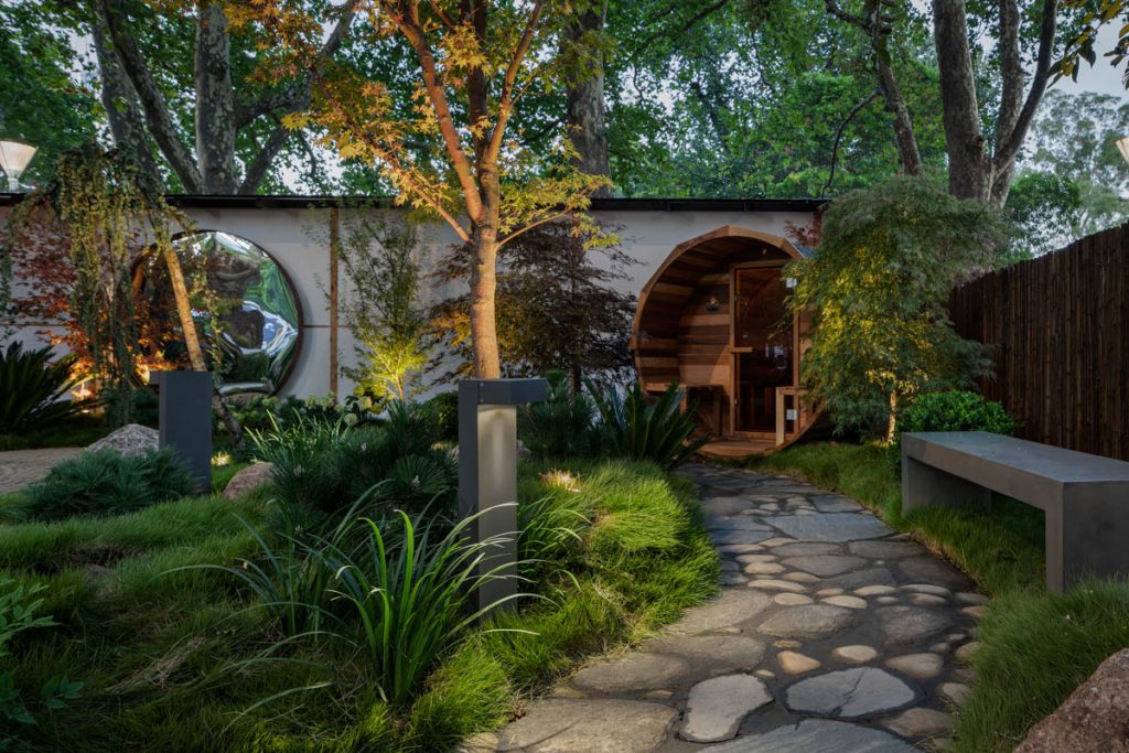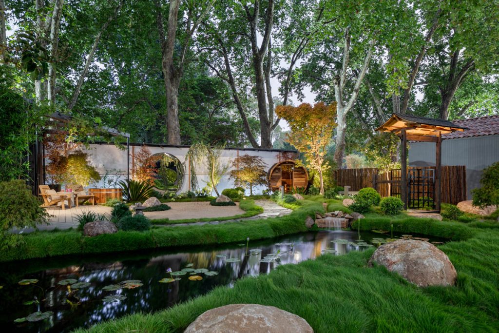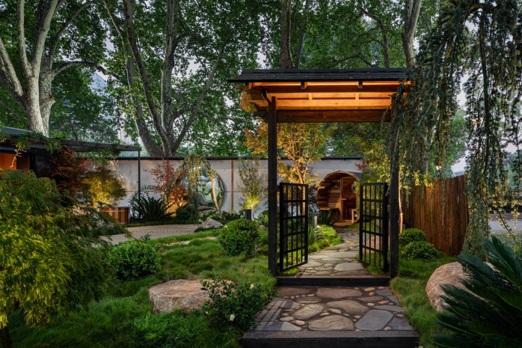 Drawing on the Japanese philosophy of “intentionally slowing down,” YUTORI creates a space of deep calm and mindfulness. The garden integrates a sauna, ice bath, and tiny home into a tranquil natural landscape – complete with raked sand, hand-laid stone pathways, and a gently flowing stream leading into a pond dotted with water lilies. Every element encourages stillness, reflection, and a moment of pause in an increasingly fast-paced world.