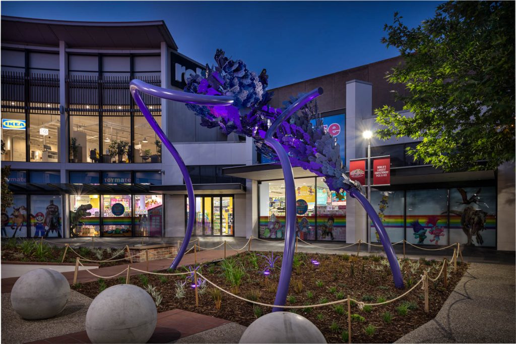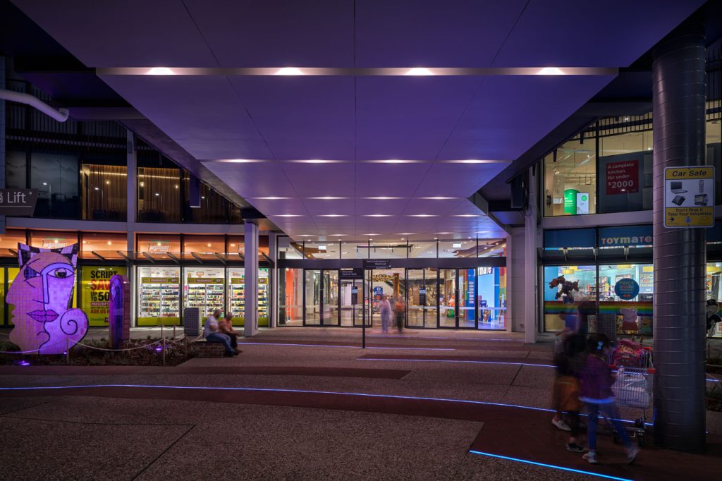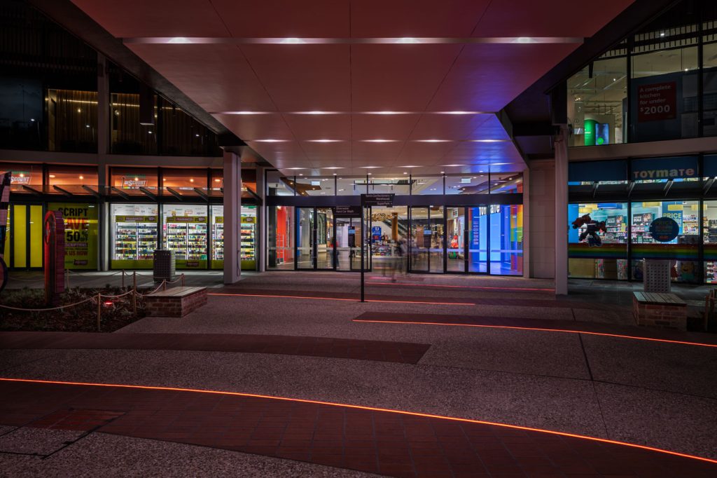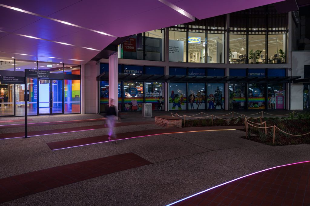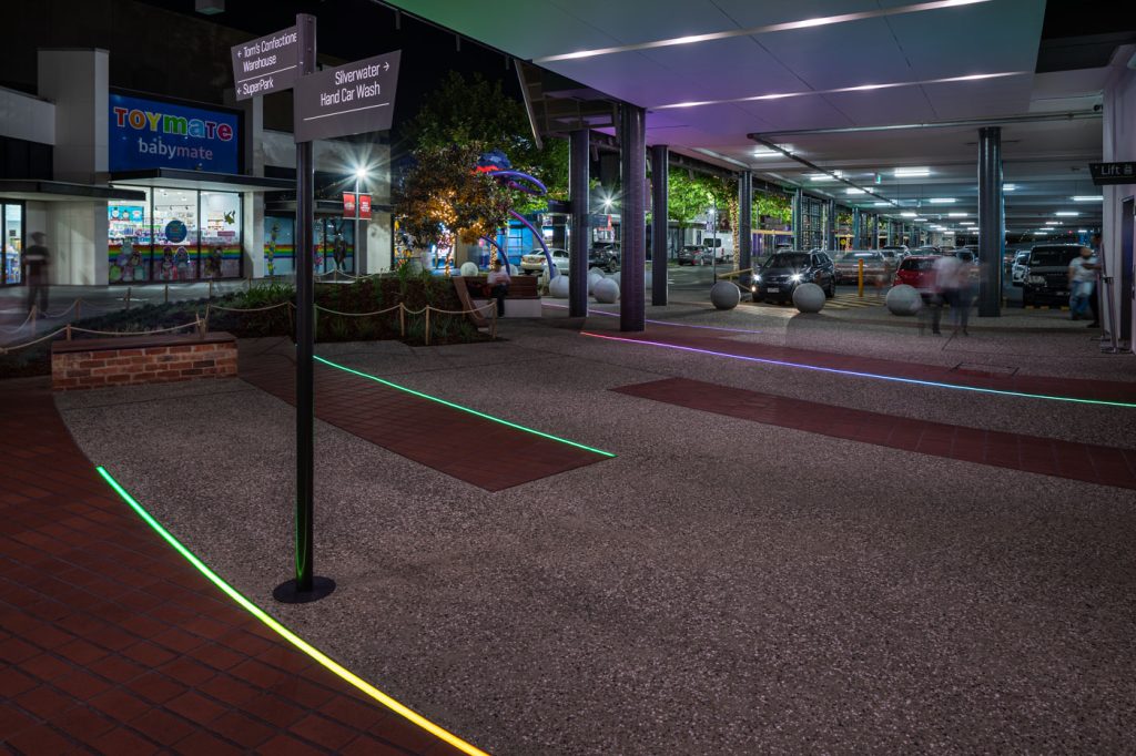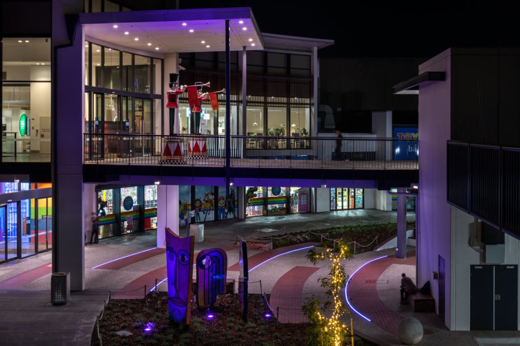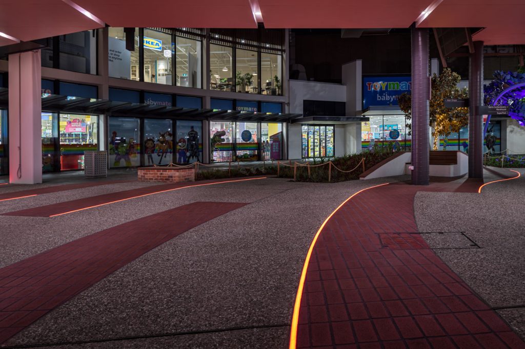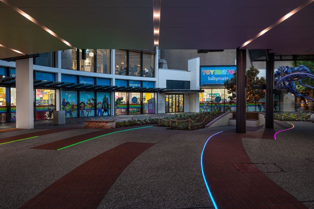 The extensive hard and soft landscaping package included new exposed aggregate and paving, meticulously designed with inground curved strip lighting supplied by Darkon with installation by Elekron and commisioning by Clear Control. This feature allows for thematic adaptations for various events throughout the year, infusing bursts of vibrant dynamic color into the main plaza entrance.