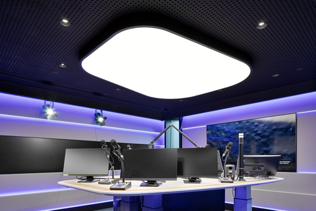 However, the real highlight of the project is the custom-made 2m x 1.8m vacuum-molded lightboxes. These stunning lightboxes are located above the on-air Producers and are the major design feature of the space, envisaged by Siren Design Group to provide a dramatic and dynamic visual element that sets the tone for the entire office.