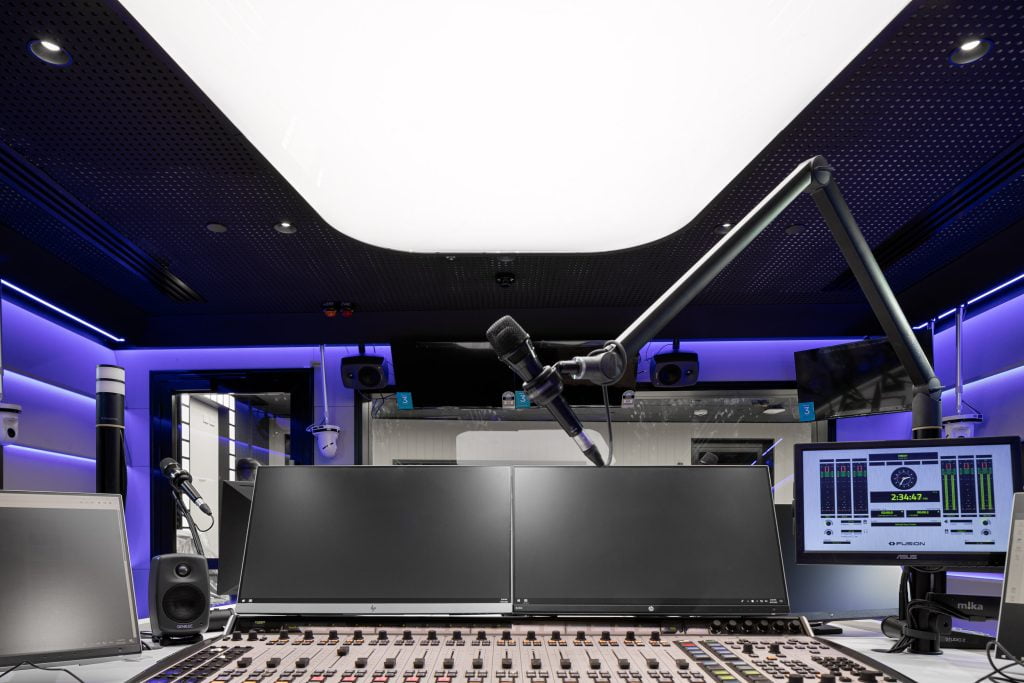 FDC Construction & Fitout and SKS Technologies, who delivered this phenomenal fit-out in a short construction program for Gattica Projects, deserve credit for their outstanding work. They worked tirelessly to create a space that truly represents the brand identity of the client, SCA, while also ensuring that the studios look and feel contemporary and inviting for guests and announcers alike.